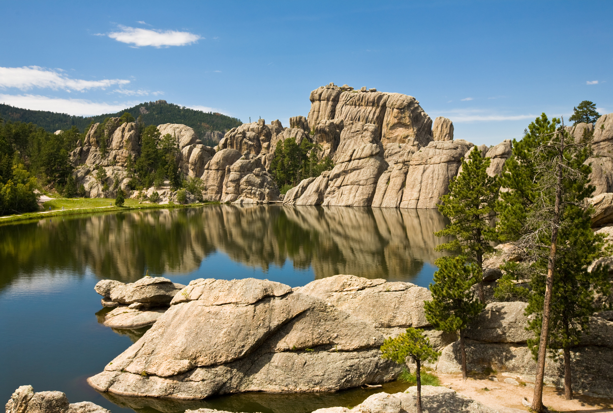 The sparkling clear 17 acre Sylvan Lake is located in the gorgeous Custer State Park, nestled in the Black Hills of South Dakota. From a landscape featuring chiseled grey rocks, towering emerald green pine trees, glistening mirror lake waters, stunningly blue skies with pristine clouds, there’s no shortage of scenic views. It’s so gorgeous it doesn’t even seem real!